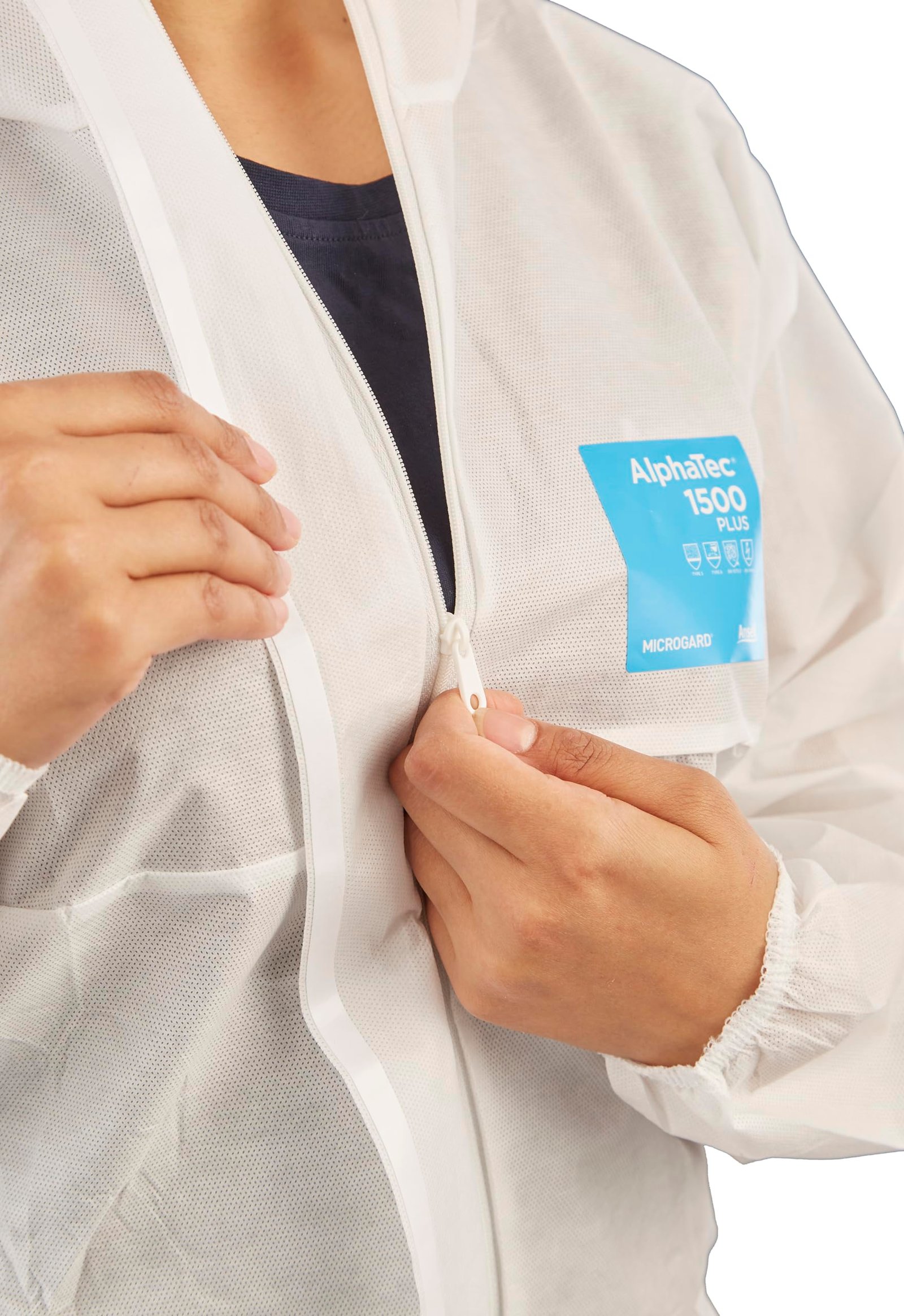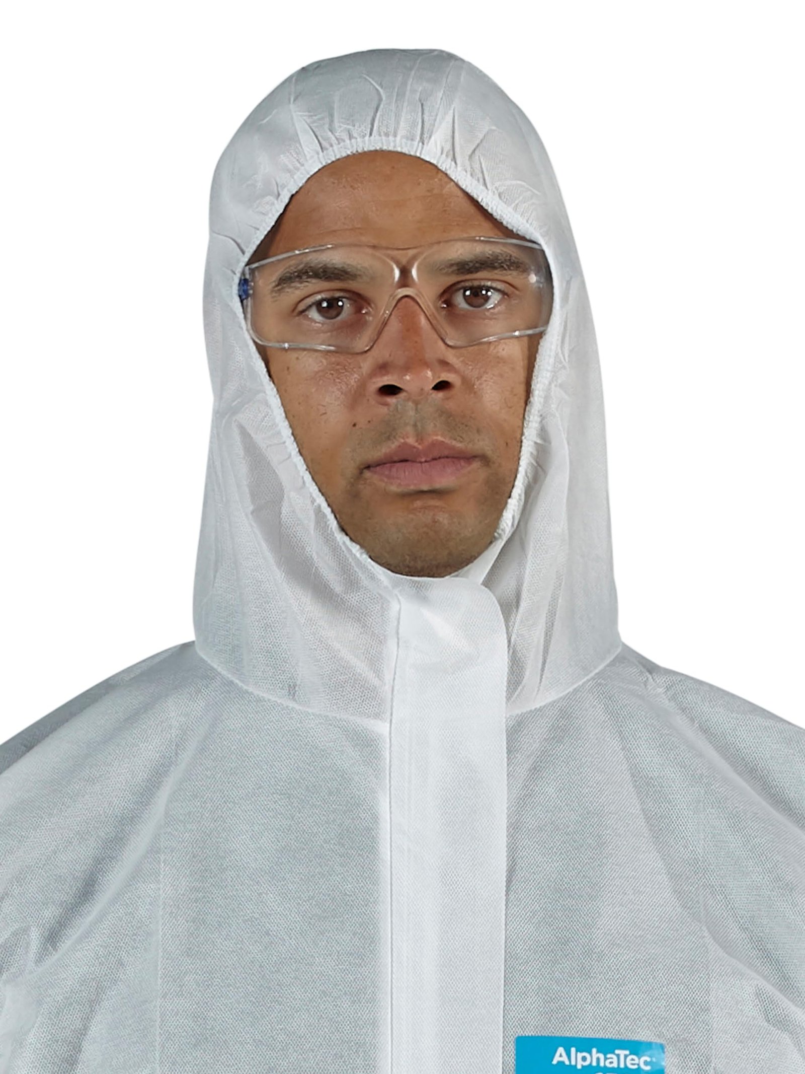 Ansell AlphaTec 1500 Model 111, Disposable Work Overall with Hood, Chemical Protection Type 5/6, Water Repellent Coverall Suit, Industrial Safety Workwear, Men Women, White, Size 3XL (1 Unit)