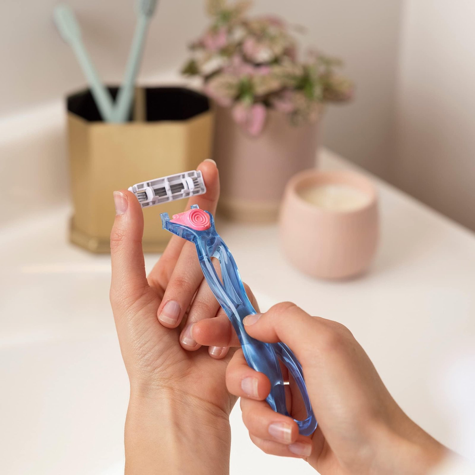- Beautifully curved blue handle specially designed for the way women shave, providing controlled handling even when wet
