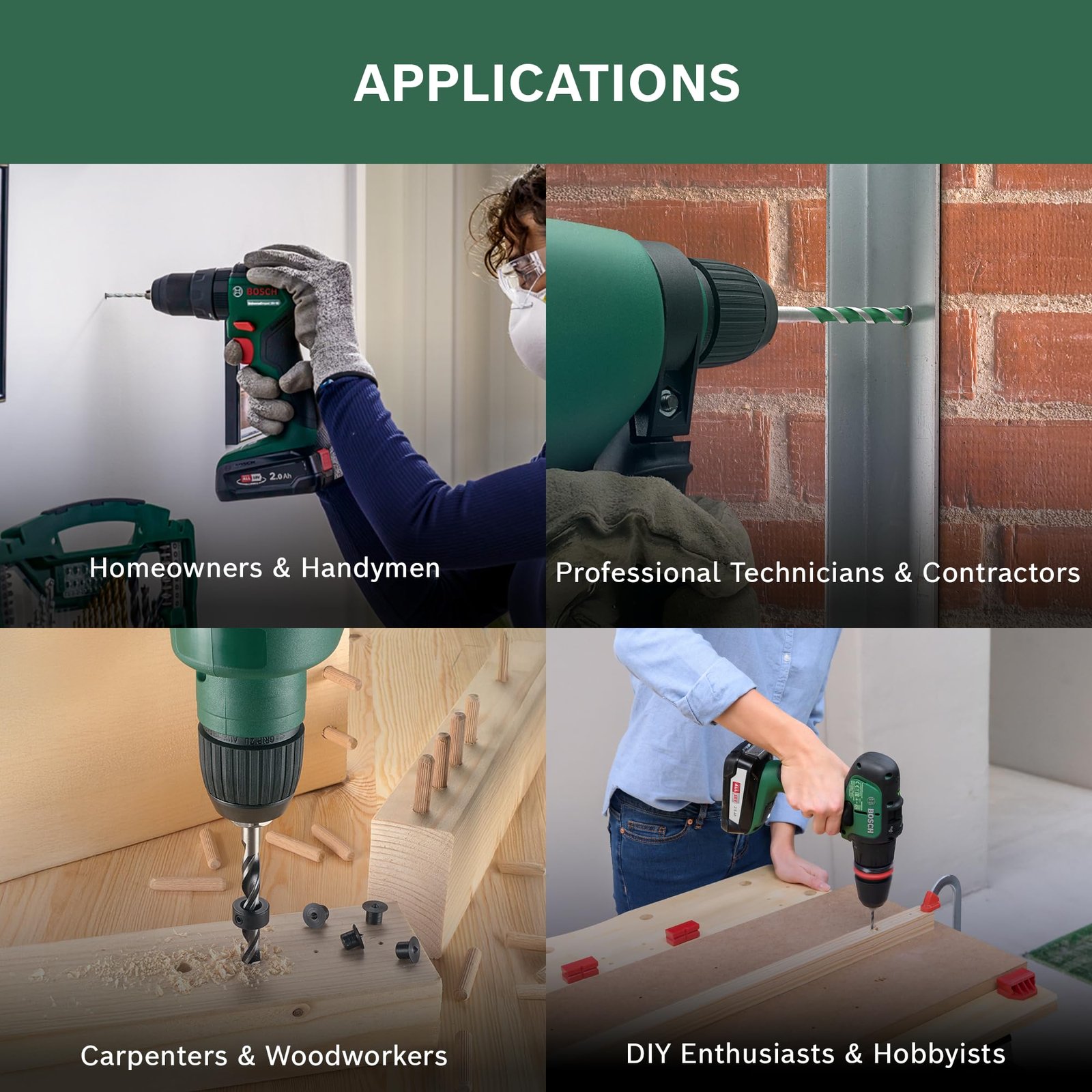 • Twist drill bits for metal, plexiglass and plastics, masonry drill bits for masonry, limestone, natural stone and cast stone, brad point drill bits for hard wood, soft wood and plastic