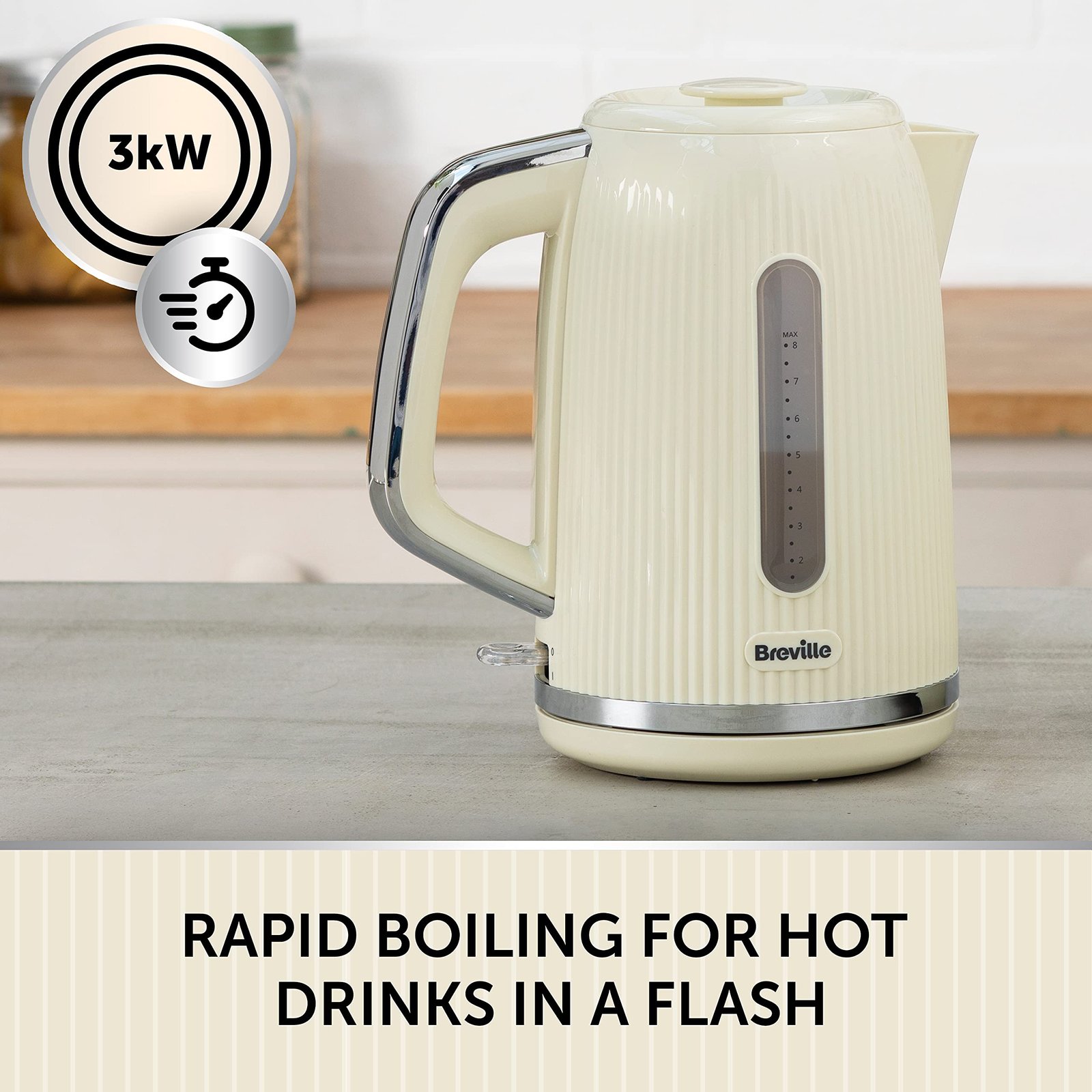 - RAPID BOILING: 3kW concealed element; 1.7L capacity makes 6 to 8 cups