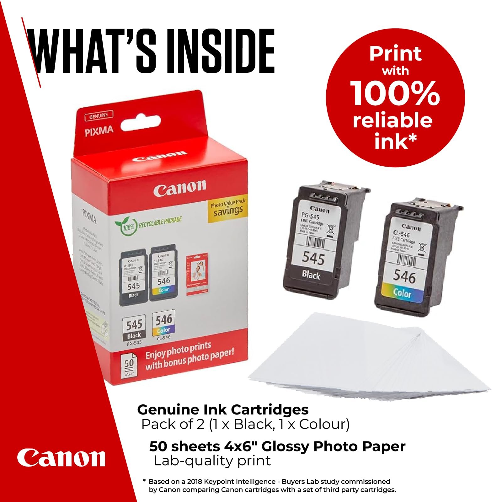 Canon Ink & Paper Multipack – PG-545/CL-546 Genuine Printer Ink Cartridges 2 Pack (1 x Black, 1 x Colour) & 4×6 Photo Paper (50 x Sheets)