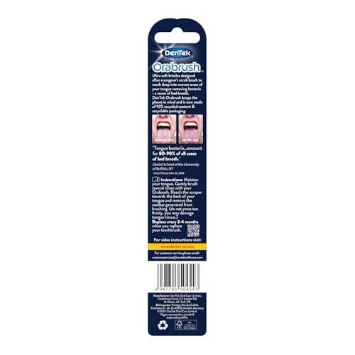 Details: Did you know 90% of bad breath comes from a dirty tongue? The 2 in 1 Orabrush Tongue Cleaner cleans tongues in a way toothbrushes simply can’t handle! It is designed to help remove odour-causing bacteria, as it features ultra-soft, micro-pointed bristles that reach deep into the uneven crevices of your tongue to loosen and lift away bacteria. The built-in scraper then collects and removes the bacteria and residue generated from brushing for cleaner breath. DenTek Orabrush keeps the planet in mind and is now made of 92% recycled content & recyclable packaging. Replace your Orabrush every 3-4 months.