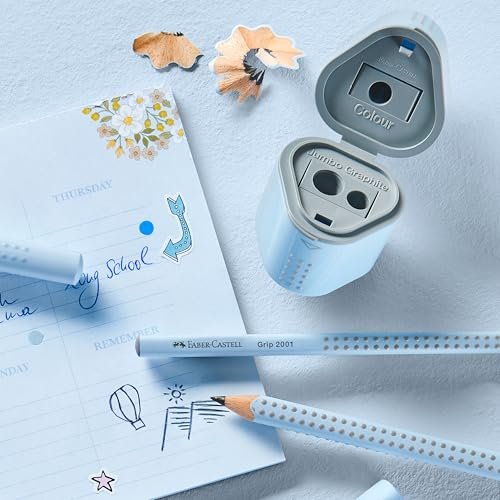 Details: The Grip 2001 pencil set in sky blue consists of three pencils, a can sharpener and an eraser. The three Grip 2001 pencils have a length of 175 mm and a degree of hardness B. With their ergonomic triangular shape, they ensure fatigue-free writing and the patented grip zone prevents fingers from slipping. The pens have an environmentally friendly water-based paint finish and a break-proof lead. With the eraser, clean and smear-free erasing is possible. Furthermore, it is PVC-free and has an ergonomic triangular grip zone. The sharpener is suitable for lead and coloured pencils, as well as all common pencil shapes. It has an extra large chip container and has a triangular shape. All items in the set are in black. Other items can be found in our brand shop. Click on the brand name Faber-Castell below the product title.