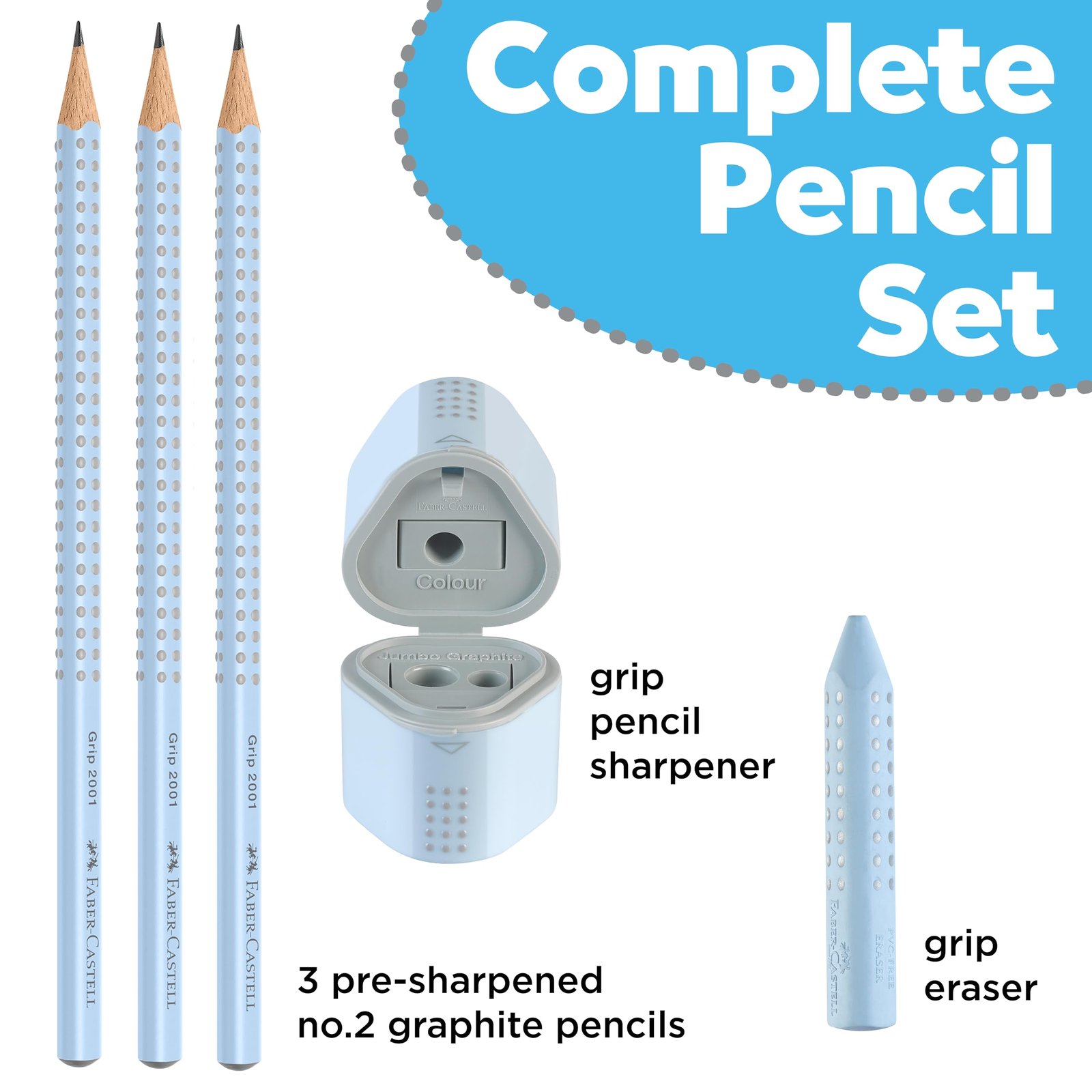 - The Grip 2001 writing set consists of three pencils, an eraser and a triple sharpener in sky blue