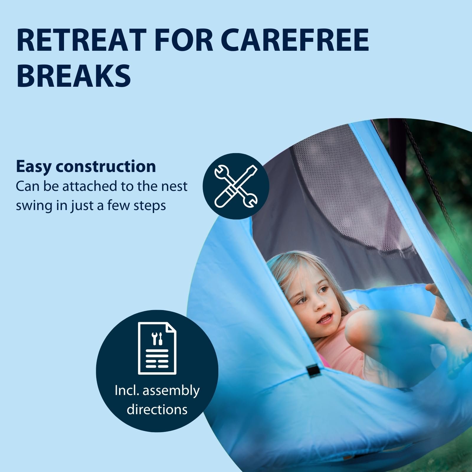 - VERSATILE – The swing tent is available in two sizes & colours: in blue, for nest swings with a diameter of 90cm & in lemon, for 110-120cm diameter. Both versions have a tent height of 108cm and 123cm.