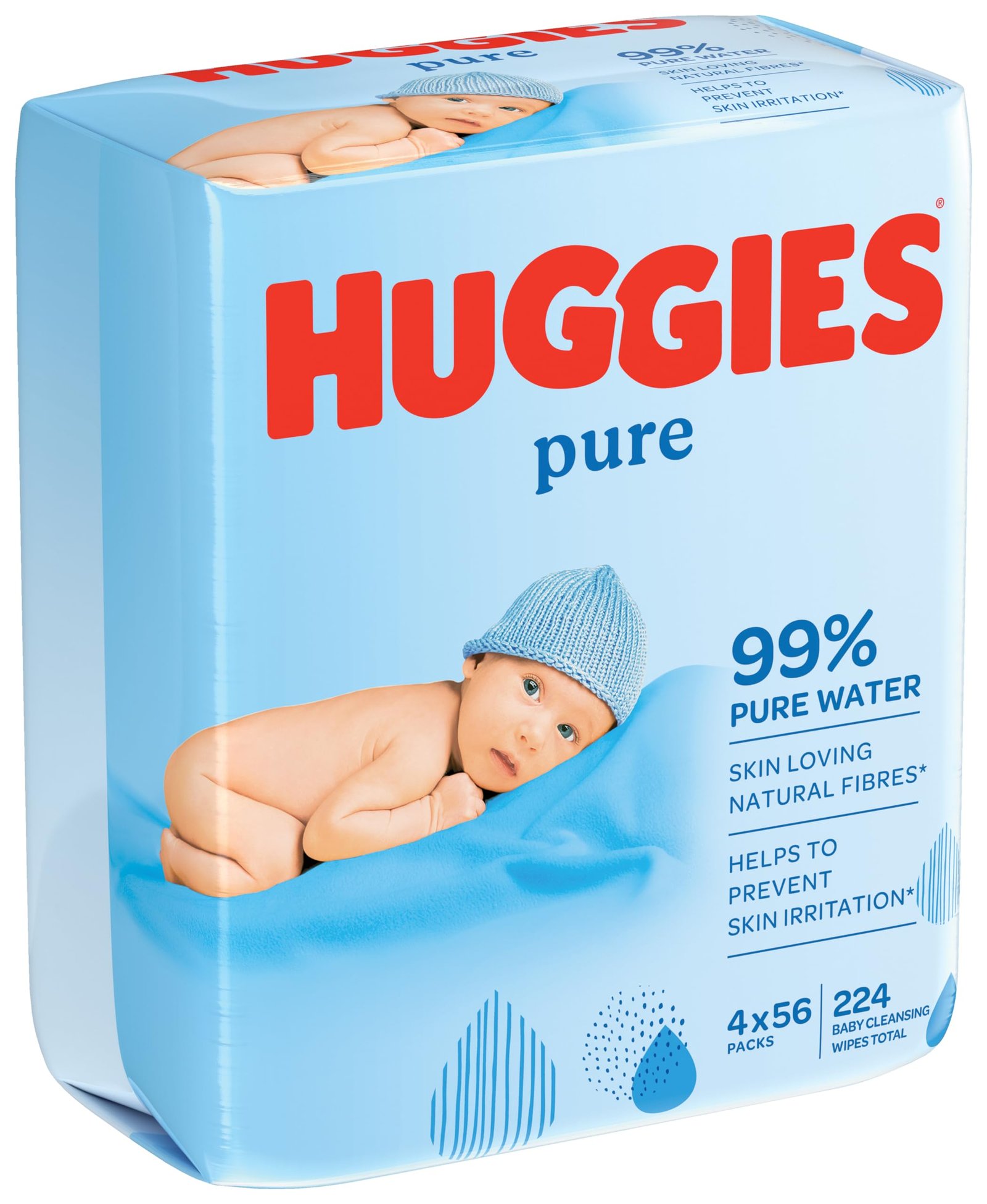- Purchase 4 packs of baby wipes – Mop up mess and carefully clean new-borns to toddlers with 224 Huggies Pure Baby Wipes. These 4 packs each contain 56 wipes that are both caring and sensitive on your child’s skin