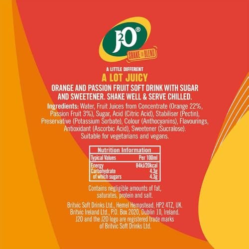Ingredients: Water, Fruit Juices from Concentrate (Orange 22%, Passion Fruit 3%), Sugar, Acid (Citric Acid), Stabiliser (Pectin), Preservative (Potassium Sorbate), Colour (Anthocyanins), Flavourings, Antioxidant (Ascorbic Acid), Sweetener (Sucralose).