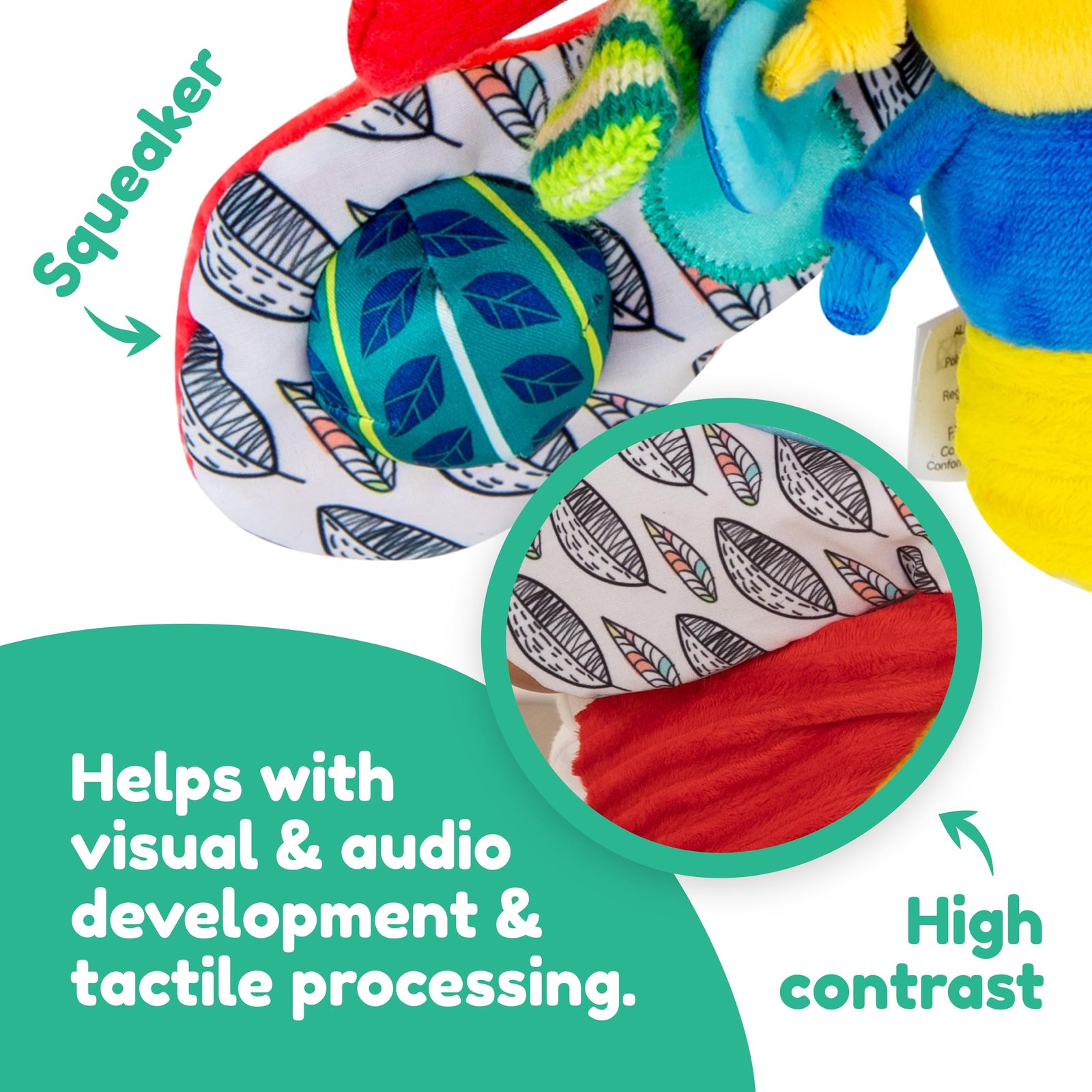 - SENSORY TOY – This baby toy comes with high contrast black and white patterns, a discovery mirror, crinkle wings, click-clack rings and a squeaker to keep your baby entertained while stimulating their senses