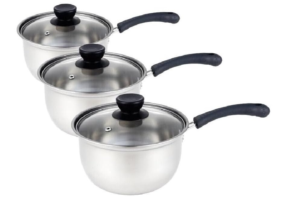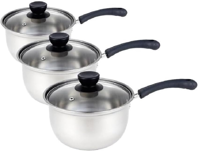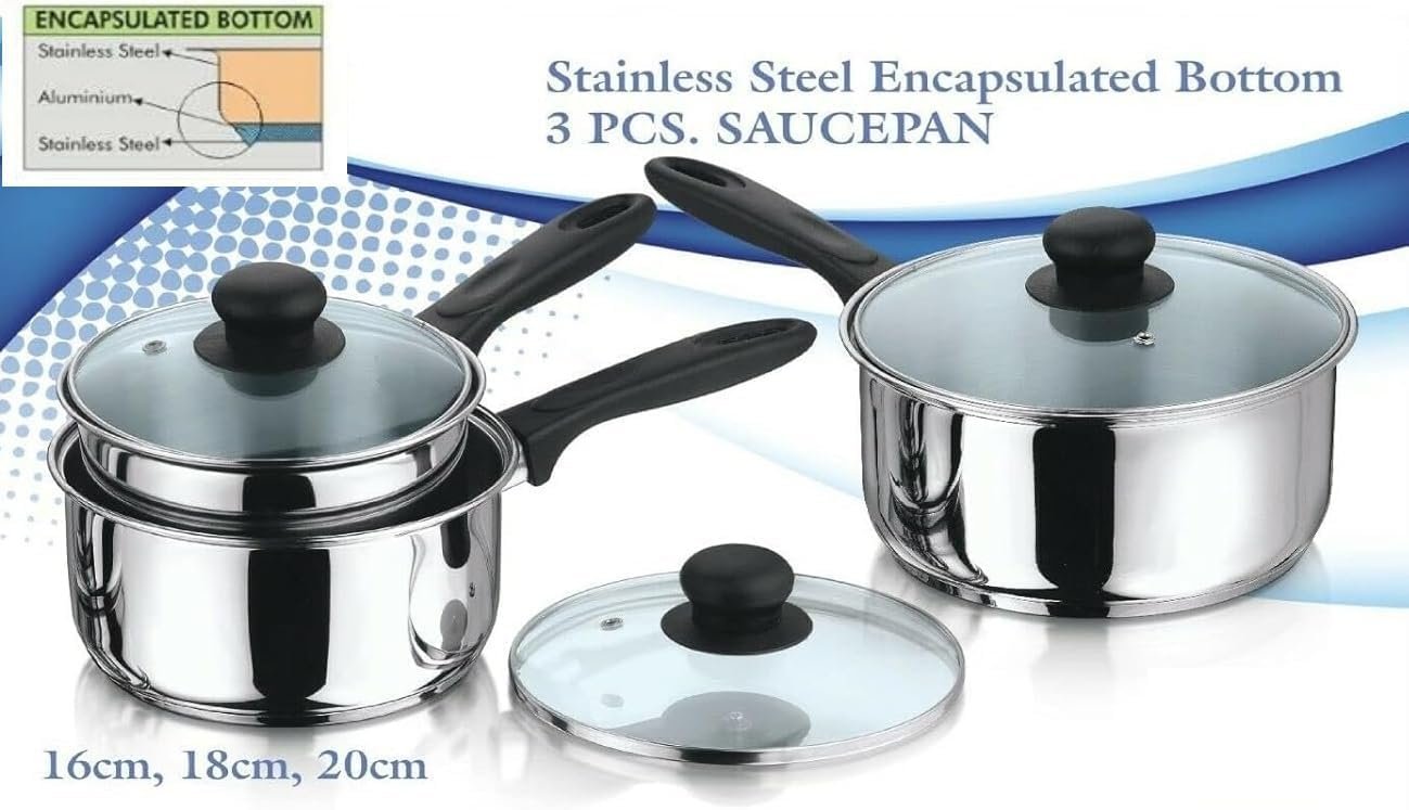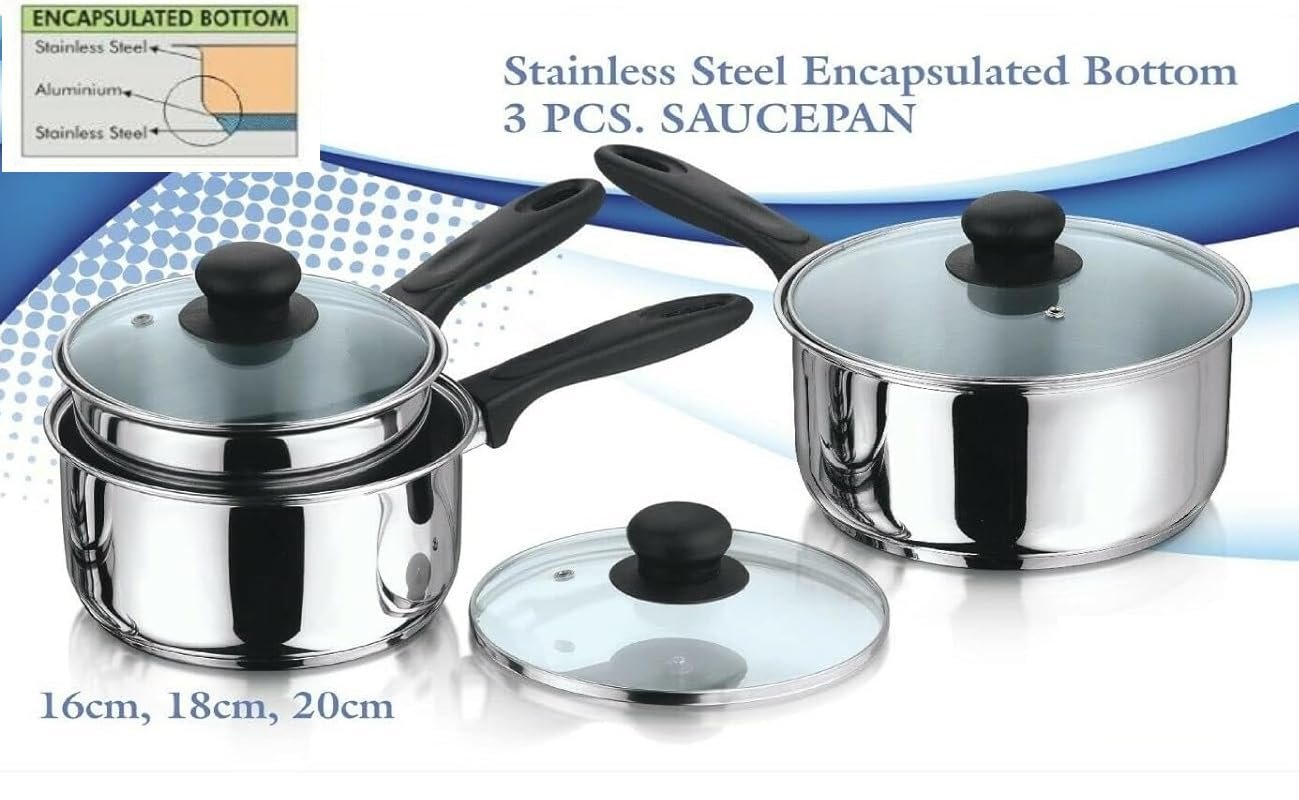 Nobel Stainless Steel Deep Saucepans with Glass Vented Lid,Phenolic Heat Resistant Handles, Encapsulated Bottom, Ideal for All hobs. Uncoated (Set 3-16,18,20)