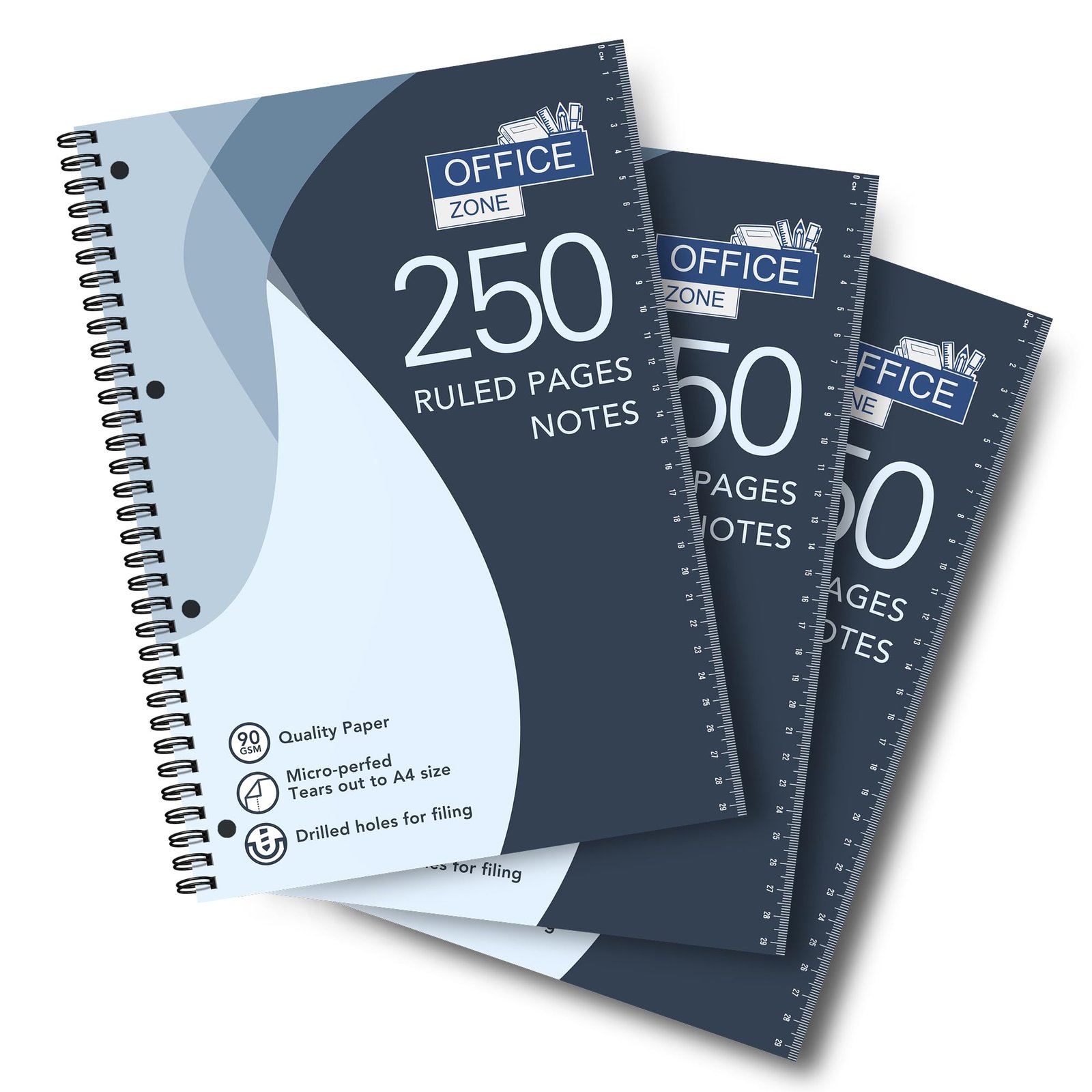 Office Zone 250 Ruled Pages Notebook | Premium 90gsm Quality Paper | Micro-Perforated Tear-Out Sheets to A4 Size | Drilled Holes for Filing | Integrated Ruler Scale on Front Cover