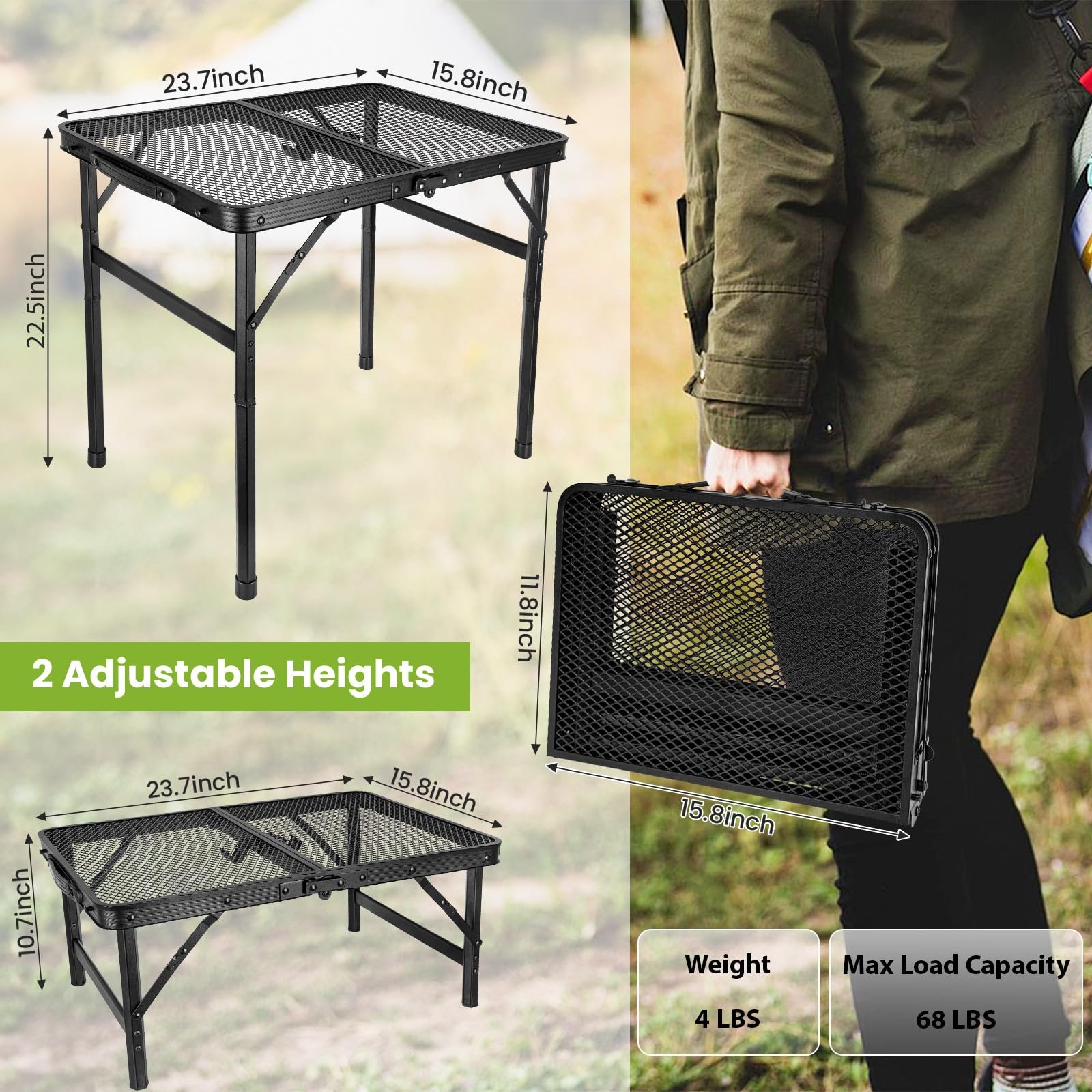 - Versatile Height Options: Camping grill table unfolds to a spacious 23.7 “L x 15.8 ”W surface area, our table offers adjustable height settings that cater to both adults and children. With two adjustable heights (10.6“ and 22”), it can be used comfortably while sitting or standing, making it ideal for any occasion