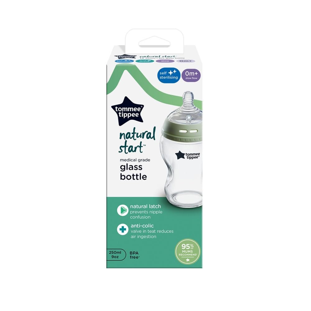 Tommee Tippee Natural Start Glass Baby Bottle for 0m+, 1x 250ml Baby Bottle with Slow Flow Breast-Like Teat for a Natural Latch, Self-Sterilising and BPA Free, Baby Feeding Essentials