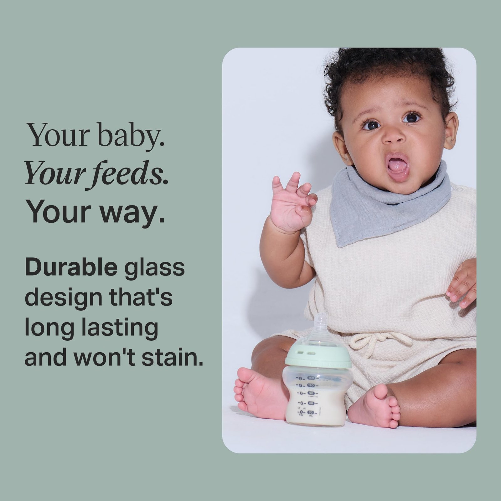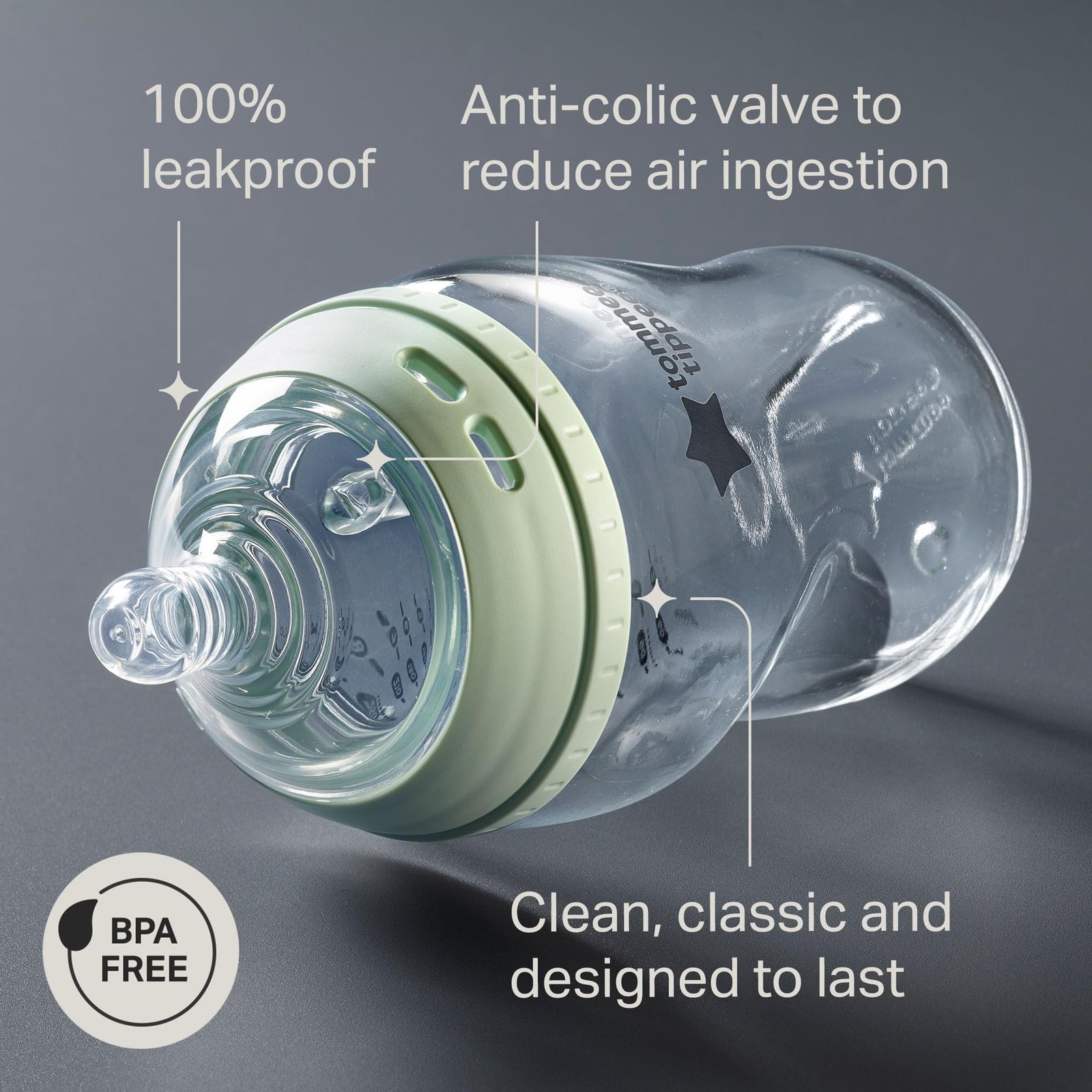 Tommee Tippee Natural Start glass bottles are durable and baby-safe. Designed to last and look like new for longer, these borosilicate glass baby bottles are scratch and stain resistant and won’t absorb smells or flavours from breast milk or formula. With a breast-like teat, Natural Start bottles are #1 for easily switching between breast, bottle and back again*. They have a smart self-sterilising design and a built-in anti-colic valve in the teat that’s proven to reduce air intake*. • Made from baby-safe borosilicate glass • 95% of babies accept a Tommee Tippee bottle* • 3-step self-sterilising 1. Add 50ml of water (use the dotted line as a guide) 2. Rest the assembled lid, ring and teat on top (but don’t fasten) 3. Microwave for 3 minutes • Leak proof with the lid on (even when upside down) • Always BPA, BPS and Phthalate free *To verify, please visit the Amazon product page