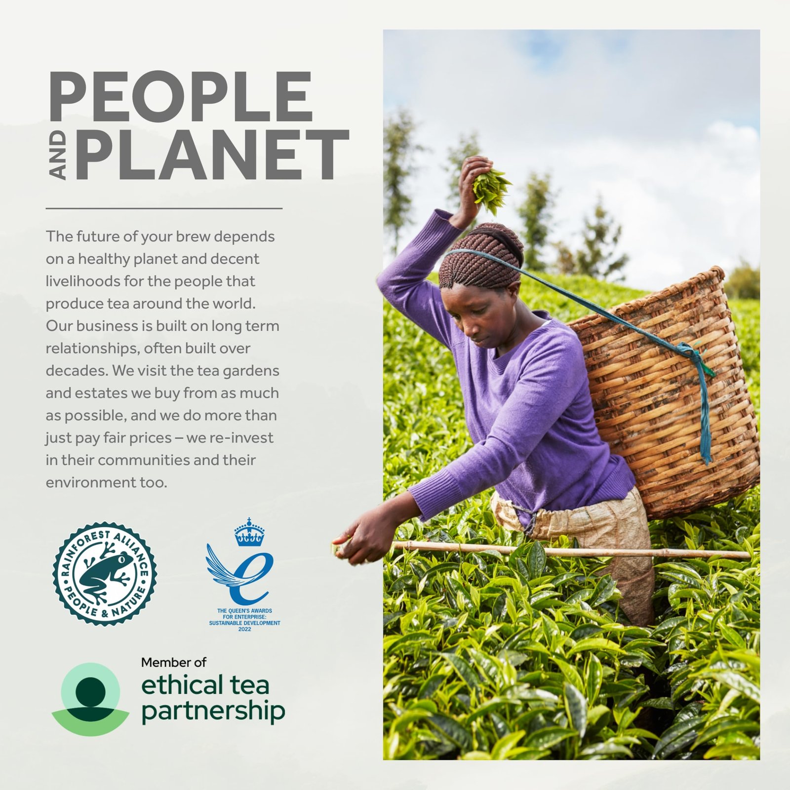 • MAKING A PROPER DIFFERENCE – We’ve built close relationships with brilliant tea gardens which share our love of fairness, flavour and quality and we trade in a way that respects people and planet. Why? Because it makes a proper difference